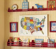 For by-the-bed book storage, I purchased the collector’s shelves below (also from Pottery Barn). Luke and Levi each have a shelf mounted by their headboard (particularly convenient for bunk beds). The shelves are just deep enough to hold a water bottle and a favorite toy or two along with bed-time reading material.