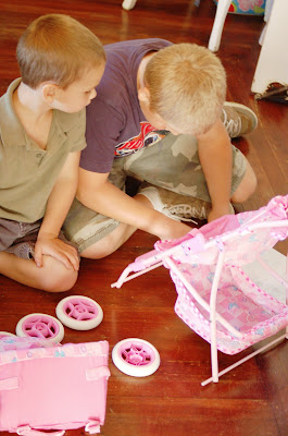 Drake and Luke are two peas in a pod. Both of them love to put things together, even if it is a pink doll stroller.